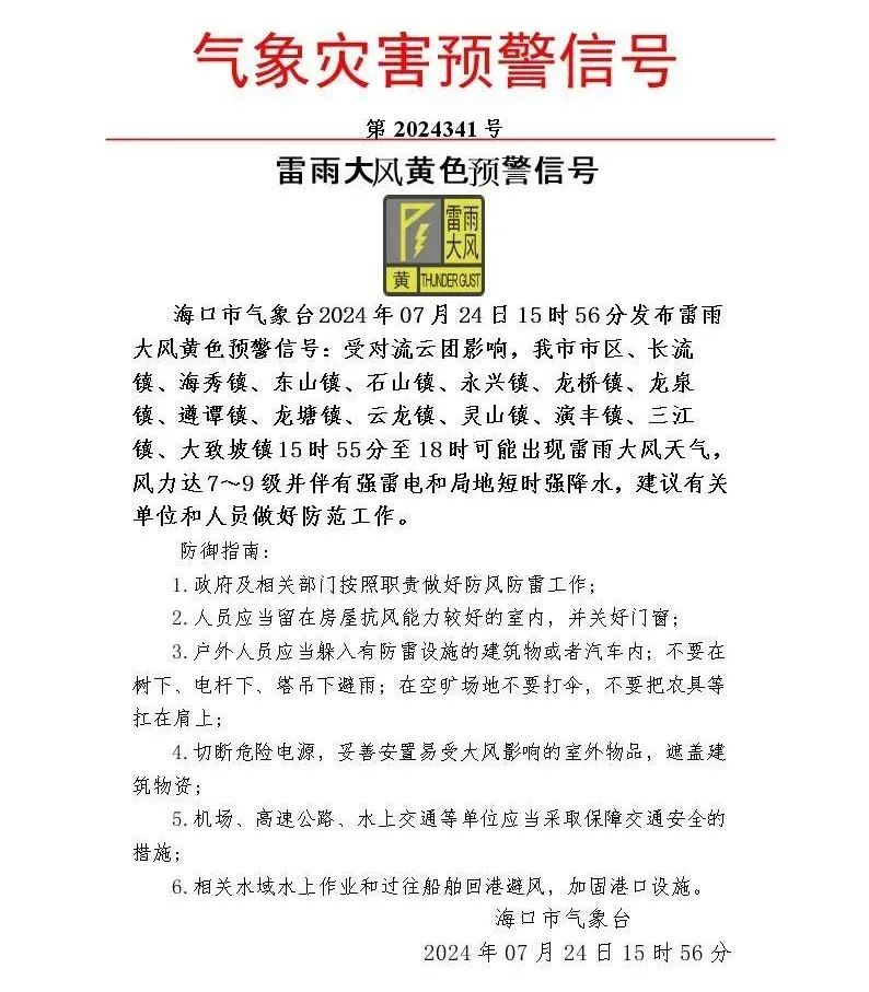 转自:海口发布 今天(7月24日)15时56分 海口市气象台发布 雷雨大风黄色预警信号