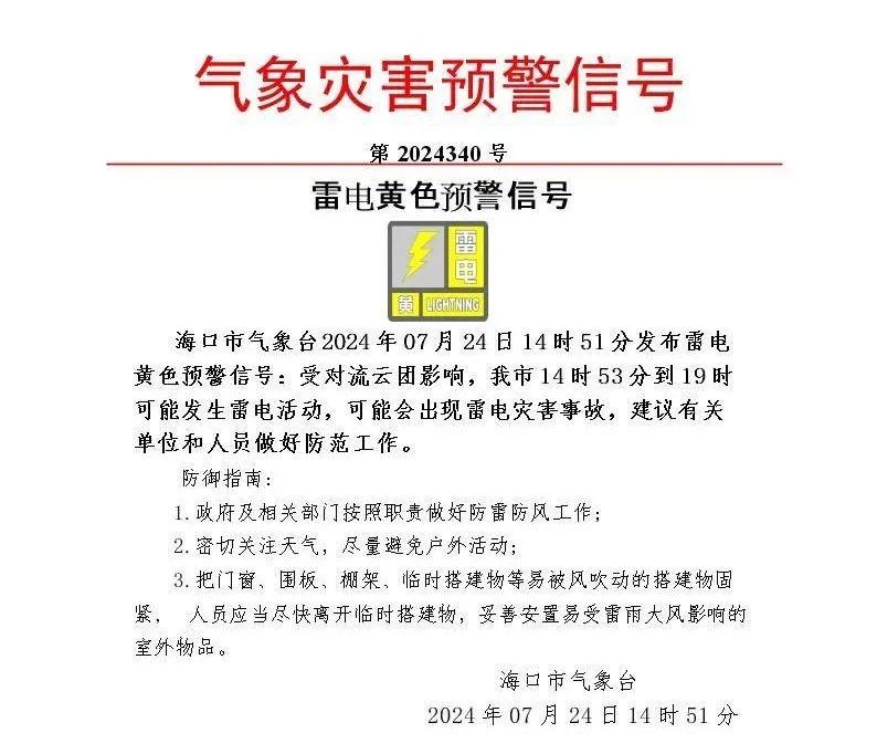 14时51分 海口市气象台发布 雷电黄色预警信号
